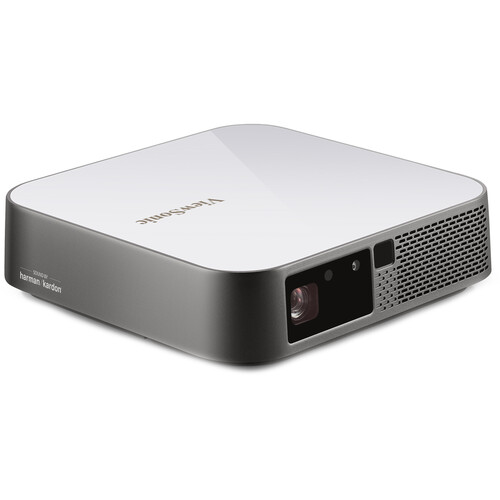 The ViewSonic M2e is a 1000-Lumen Full HD Smart DLP Projector. Its 1000 lumens of brightness can produce images up to 100" diagonal in moderately lit rooms, and it's compact. Shorter throw lens project up to 100-inches from 8-feet 9-inches. Thanks to a built-in auto-focus feature, as well as horizontal and vertical keystone correction It s quick and easy to set up. Enjoy a crystal-clear image no matter where you place your projector. The M2e has dual 3W Harman Kardon speakers built-in to eliminate the need for external speakers, simplifying its ease of transport and setup. ViewSonic Cinema SuperColor+ technology delivers 125% of Rec.709 color accuracy and HDR content support that produce incredibly vivid and lifelike colors for a fuller, more immersive viewing experience. It also has onboard HDMI, USB Type-A, and USB Type-C ports, plus a microSDXC card slot, enabling you to project from multiple types of source devices. Wi-Fi and Bluetooth connectivity is built-in, so you can stream from your compatible phone or tablet. Bluetooth connectivity also allows pairing with compatible headphones or speakers for added versatility. This projector uses solid-state LED technology that is free of mercury, lamps, and filters. The LED light source provides up to 30,000 hours of usage while consuming less than half the power of a typical LCD TV, thereby lowering your total cost of ownership. Its lightweight design allows it to be easily carried around. A tripod mount on the bottom allows for a quick, easy setup at trade shows, conferences, classrooms, and more. It has a 1-year warranty.